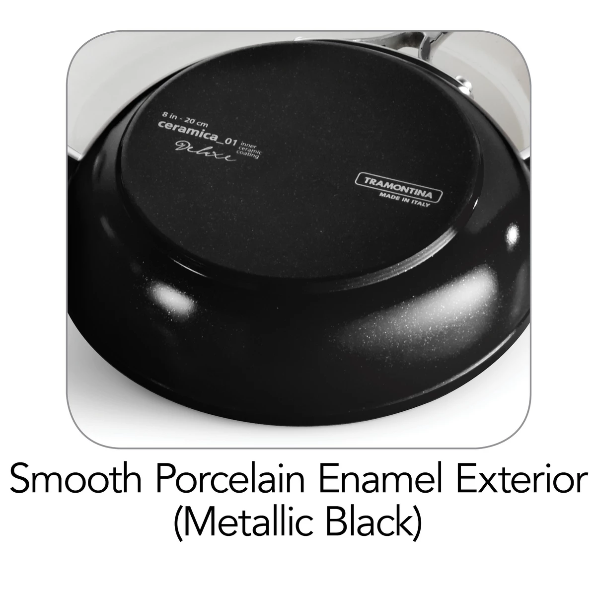 Tramontina”s Ceramica Deluxe 10 Pc Cookware Set is the perfect option for stocking your kitchen with stylish pieces to create a wide variety of recipes. Its heavy-gauge aluminum construction and metallic black porcelain enamel exterior can handle just about any culinary task with a low-effort clean-up. The interior ceramic coating technology is made without PTFE, PFOA, lead or cadmium. The ergonomically designed silicone soft-grip handles provide extra comfort for handling and control. Dishwasher-safe and compatible with gas, electric, and ceramic glass cooktops this set can handle your busy kitchen and your heartiest recipes all with the quality and durability you count on from Tramontina.
