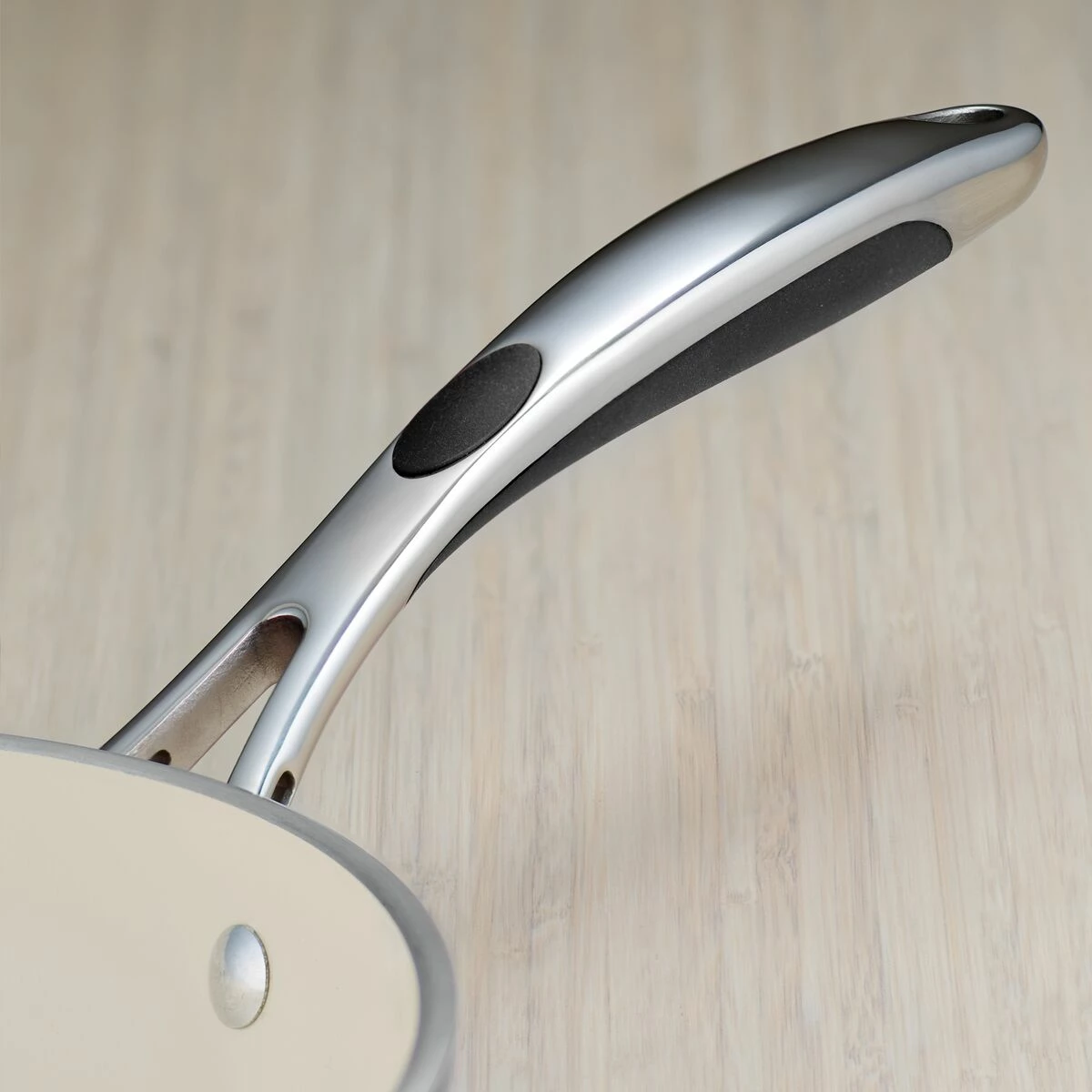 – Ergonomically designed riveted cast stainless steel handle with silicone