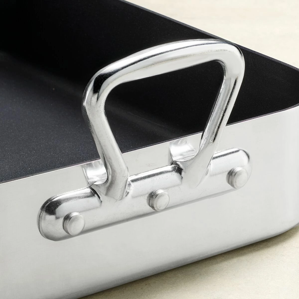 Produce restaurant-quality meals at home! Ever wonder how you get picture-perfect, and palate-perfect, succulent roasted meats and poultry that”s tender and juicy inside and beautifully browned on the outside? Tramontina”s Polished Aluminum 16″ Nonstick Roasting Pan comes with a V-rack that allows you to elevate your roast or bird, making it easier to baste and catch drippings in the pan below. Large cast aluminum handles provide a comfortable, balanced grip making it easier to carry.