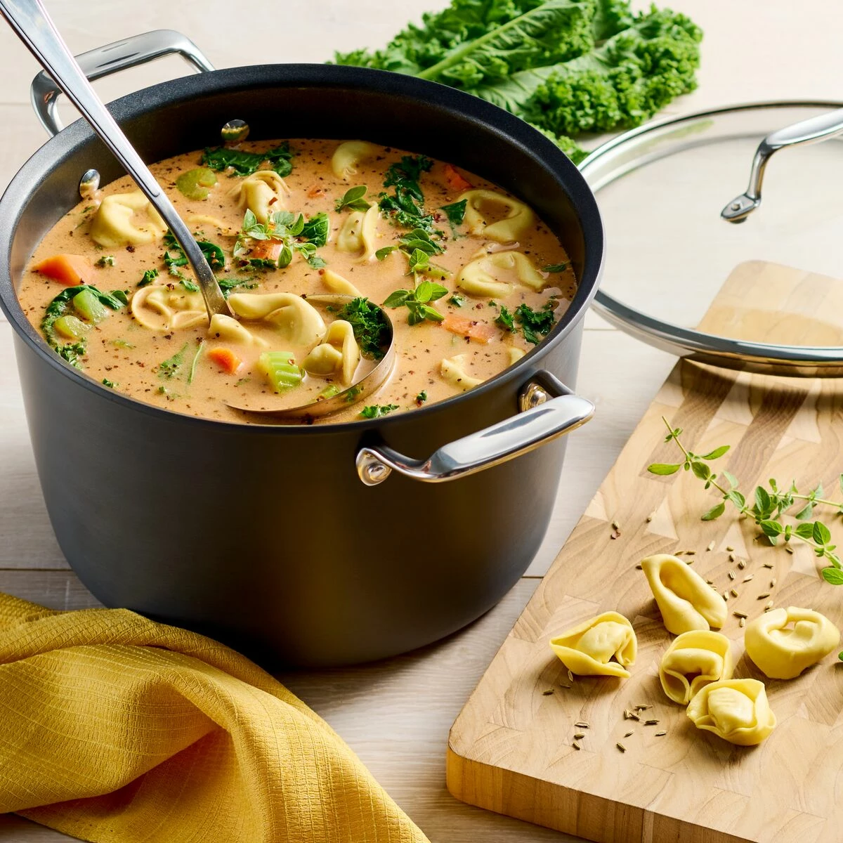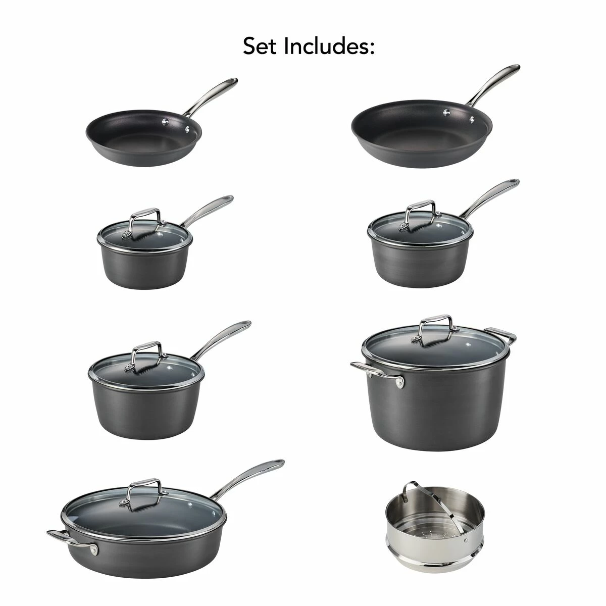 Big families, small restaurants, dinner with your place with friends – Tramontina”s durable, versatile Gourmet 13 Pc Hard Anodized Aluminum Nonstick Cookware Set can stand up to it all. Made from heavy-duty, hard-anodized aluminum, each piece in the set is made to conduct heat evenly and quickly. Hard anodized cookware is known for its durability, resistance to scratching, and versatility. A smooth, dark gray, fine satin finish covers the cookware”s exterior, while a reinforced nonstick coating covers the interior for quicker, cleaner, and healthier cooking. Maneuver your pots and pans with ease, thanks to precision-cast, mirror-polished, stainless-steel long and side handles. You”ll be able to watch your cooking progress through heat- and shatter-resistant tempered glass lids with stainless-steel rim that features a fine satin finish. The set is compatible with gas, electric, and ceramic glass cooktops, and oven-safe up to 350ยฐF / 176ยฐC. Hand-wash to clean. This set includes all the essential pieces you need to prepare everything from breakfast to dinner.
