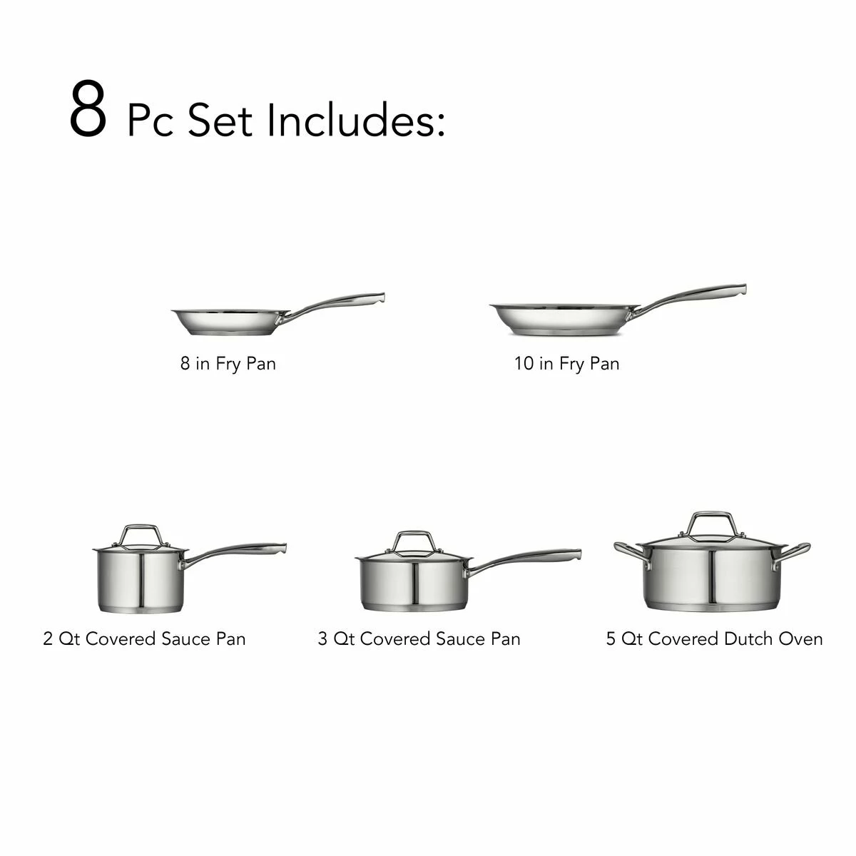 Outfit your own kitchen or gift avid cooks and newlyweds with Tramontina”s Prima 8 Pc Cookware Set specifically crafted to cover a wide variety of cooking tasks – on your cooktop or in the oven. The Tramontina Prima cookware line combines a modern style, exceptional performance, durability, and quality for chefs and cooking enthusiasts alike. Its tri-ply base is impact-bonded with a pure aluminum core between a layer of 18/10 stainless steel and a layer of magnetic stainless steel, providing even heat distribution and compatibility for all cooktops, including induction. The 8 piece set includes: 8 in fry pan; 10 in fry pan; 2 Qt covered sauce pan; 3 Qt covered sauce pan, and a 5 Qt covered Dutch oven – everything you”ll need for everyday cooking on a cooktop, in the oven, and under a broiler.